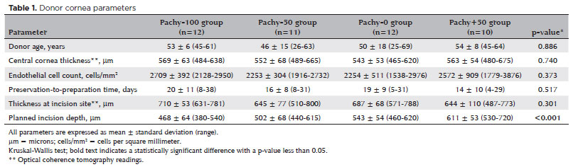 RESULTS: Endothelial perforation occurred only in the Pachy+50 group (n=3, 30%). Central lamella’s thickness in Pachy-100, Pachy-50, Pachy-0, and Pachy+50 groups measured 185 ± 42 µm, 122 ± 29 µm, 114 ± 29 µm, and 58 ± 31 µm, respectively (p<0.001). The overall 3.0- and 6.0-mm C/P ratios were 0.97 ± 0.06 and 0.92 ± 0.14, respectively. Preoperative donor characteristics were not correlated with most thickness outcomes. The planned incision depth correlated significantly with most lamella’s thickness parameters (p<0.001). The overall thickness of the lamella negatively correlated with the planned incision depth (p<0.001, r=-0.580). The best outcome was found in the Pachy-0 group, as 75% of the lamellae measured <130 µm and there was no endothelial perforation.