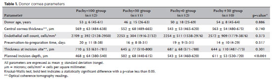 No significant difference was found among the groups regarding donor age (p=0.886), CCT (p=0.740), corneal thickness at the incision site (p=0.301), endothelial cell count (p=0.373), and time since preservation (p=0.517). The mean planned incision depths in the Pachy-100, Pachy-50, Pachy-0, and Pachy+50 groups were 468 ± 64 µm, 502 ± 68 µm, 543 ± 54 µm, and 611 ± 53 µm, respectively (p<0.001). The donor cornea parameters of each group are shown in table 1.