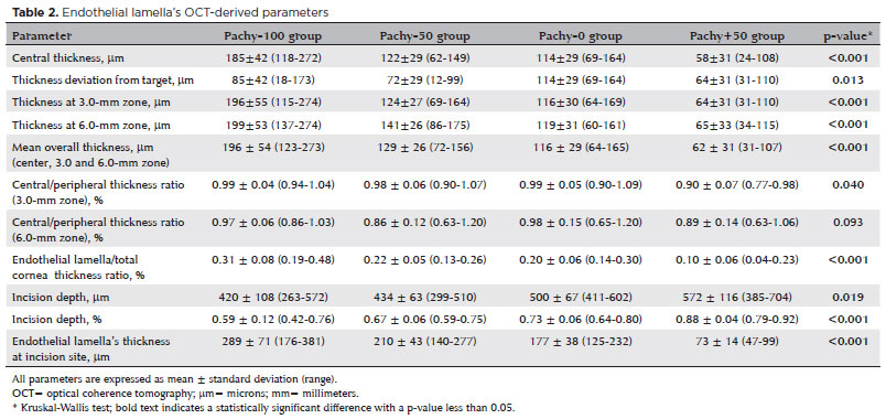 The achieved incision depth was significantly different between groups (p=0.019). Overall, the shallowest and deepest incisions were measured in the Pachy-100 and Pachy+50 groups, respectively.