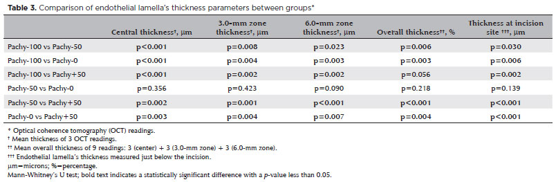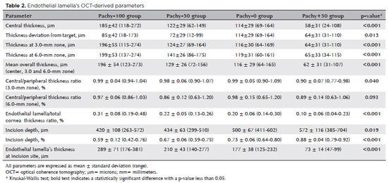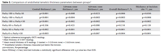 Most of the thickness-related parameters were significantly different among groups and are summarized in table 2. All two-by-two group comparisons were significant, except for the comparison of the Pachy-0 and Pachy-50 groups (Table 3).