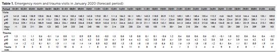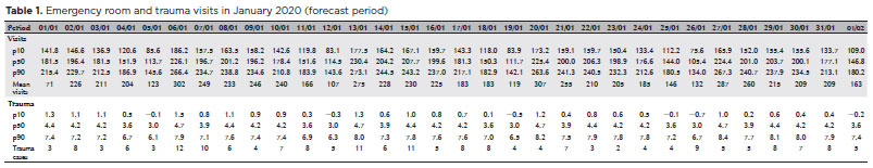 RESULTS: The forecast period predicted a mean emergency patient volume of 216.27/day in p90, 180.75/day in p50, and 140.35/day in p10, and a mean of 7.42 trauma cases/day in p90, 3.99/day in p50, and 0.56/day in p10. In January of 2020, there were a total of 6,604 patient visits and a mean of 206.37 patients/day, which is 13.5% less than the p50 prediction. This period involved a total of 199 trauma cases and a mean of 6.21 cases/day, which is 55.77% more traumas than that by the p50 prediction.
