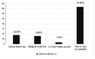 Teleconsultation, a form of interaction between doctors and patients, has become an important form of healthcare during the COVID-19 pandemic. During the pandemic, teleconsultation allowed social distancing, reducing the spread of infection(1,5). Lockdowns forced health services to implement this modality quickly to meet the population’s demand. With the benefits of teleconsultation, discontinuing this practice would be a setback. The results of this study demonstrated the possibility of maintaining ophthalmological care through a public ophthalmological service in Brazil while maintaining strict social distancing precautions.