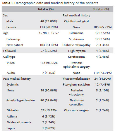 The medical records of 161 patients were analyzed. The mean age of the patients was 45.98 ± 17.57 (8-90) years, and most of the patients were women (113, 70.20%). Among the patients, 105 (65.22%) reported no previous eye disorders. Table 1 describes demographic data, diagnoses of previous ophthalmologic pathology, systemic diseases, and previous ophthalmologic surgeries. Moreover, 57 (35.60%) patients had already been consulted at the hospital previously.