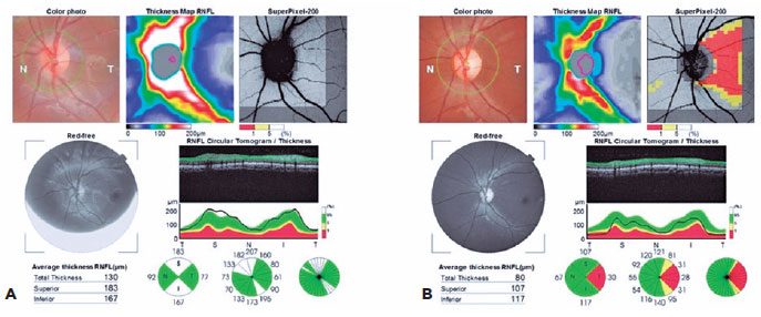 Postoperative LE OCT revealed a reduction in the thickness of the superior and inferior RNFL, as well as a significant reduction in the RNFL of the temporal sector (Figure 1B).