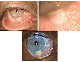 On ophthalmologic examination, the visual acuity in both eyes was 20/20. On external examination, pitting edema of the upper eyelid and diffuse ocular hyperemia were observed. No lymphadenopathy was identified on cervical and preauricular palpation. Extraocular motility was within the normal limits. Slit-lamp biomicroscopy showed copious watery discharge on the ocular surface, hyperemia and mild conjunctival vascular congestion, discrete follicles in the middle and temporal thirds of the lower tarsal conjunctiva, and three ulcerated epithelial conjunctival lesions (on the caruncle, nasal equator between the caruncle and limbus, and limbal region of the inferior nasal quadrant of the RE cornea), which measured approximately 3 × 3 mm each, with a flat surface and covered by milky white fibrotic material (Figures 2 and 3).