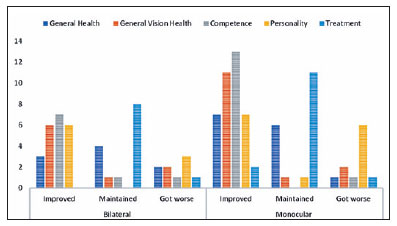 Two results are noteworthy in the family influence domain, in which seven patients had negative results. Another important aspect was personality, in which worsening states were noted in 11 of the children. This result drew attention and could be affected by the criteria considered, such as going out with friends, family, playing games, and watching TV. It is precisely due to the non-adaptation to wearing glasses, for example, and perhaps comments that could have retracted the child; thus, they would not want to go out and interact. Another possible reason was the time needed for the patient to visually readapt, which made the guardians overprotective, not allowing their child to engage in more intense physical activities due to fear of potential injuries. The children did not have access to or develop a taste for reading, for example, something that became even more difficult than before. The limitation of this study was the sample size.