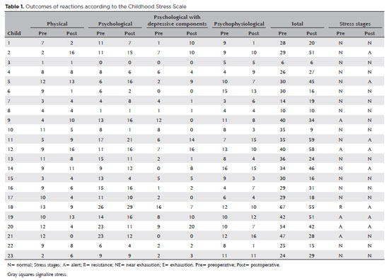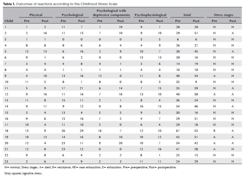 The instruments were applied after psychoprophylaxis. It can explain the results found in the CSS questionnaire, which shows that stress levels of most patients did not worsen, even after surgical procedure. Children who are aware of the importance of surgery for their well-being are calmer and more cooperative in relation to post-surgical procedures(18). Preparing the patient appropriately is the most effective way to reduce stress, even more effective than the presence of the mother. However, the characteristics of each child, age, sex, education, disease type, surgery type, health condition, previous surgical experience, family, and sociocultural integration must be considered.