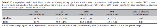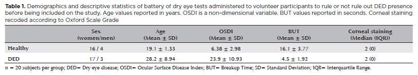 Table 1 summarizes the demographics and descriptive statistics of the battery of dry eye tests administered to volunteer participants to rule or not rule out DED presence prior to inclusion in the study. There was no statistical difference between groups in terms of gender distribution (Pearson χ2 test; p=0.677, Table 1), but there was a statistical difference in terms of age distribution (unpaired t-test; p<0.001, Table 1).