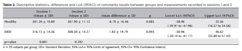 Results: There were no significant differences in osmolarity between the two sessions for either the healthy (paired t-test; p=0.085) or dry eye disease (paired t-test; p=0.093) participants. Moreover, there was no significant correlation between the means and differences in either session on healthy (Pearson correlation: r=0.020; p=0.935) or dry eye disease (Pearson correlation: r=-0.022; p=0.928) participants. In session 1, there was a significant difference in osmolarity values between groups (unpaired t-test; p=0.001), but no difference was found in session 2 (unpaired t-test; p=0.292).