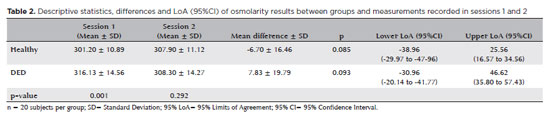 Resultados: Não foram encontradas diferenças significativas na osmolaridade entre as medidas obtidas nas duas sessões, nem no grupo de participantes saudáveis (teste de t pareado; p=0,085), nem no de participantes com síndrome do olho seco (teste de t pareado; p=0,093). Não foi detectada nenhuma correlação significativa entre as médias e diferenças entre as duas sessões entre participantes saudáveis (correlação de Pearson: r=0,020, p=0,935) e aqueles com síndrome do olho seco (correlação Pearson: r=-0,022, p=0,928). Foi encontrada uma diferença significativa nos valores de osmolaridade entre os dois grupos na primeira sessão (teste de t não pareado; p=0,001), mas nenhuma diferença foi encontrada na segunda sessão (teste de t não pareado; p=0,292).