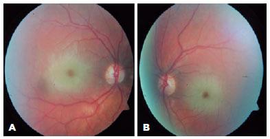 A 19-year-old female patient presented to our clinic with complaints of bilaterally decreased vision for the past 8 years. These complaints had been worsening within 5 years, which were thought to be fatigue, tremor, ataxia, and myoclonic epilepsy after simple daily activities. Her siblings had no history of neurological and ophthalmic diseases. Her best-corrected visual acuity was 20/125 on the right and 20/200 on the left. Slit-lamp examination revealed clear cornea in both eyes and multiple punctate opacities in both lenses. In the fundus examination, bilateral macular CRS was observed with its characteristic red fovea and pale macula (Figure 1). SD-OCT (Heidelberg Engineering, Heidelberg, Germany) imaging revealed hyperreflectivity of the inner retinal layers and increased hyperreflectivity on the photoreceptor layer in the foveola region (Figure 2). In the fundus fluorescein angiography (FFA), slight shading and mild hypofluorescence with a blurred appearance at the vessel borders were observed in the macula (Figure 3). The patient was referred to the neurology department, and various analyses were performed (Table 1).