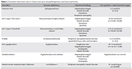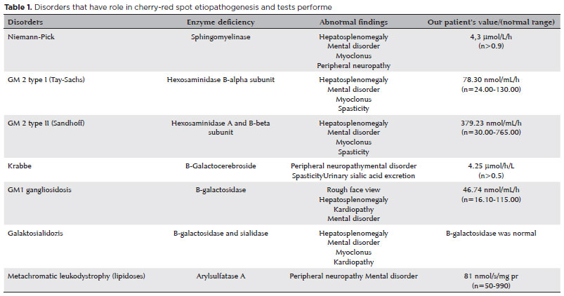 Sialidosis is a lysosomal storage disease with autosomal recessive inheritance. It is characterized by the accumulation of sialic acid-containing oligosaccharides in tissues where the activity of neuraminidase enzyme is impaired due to a mutation in the neuraminidase gene (NEU1). Sialidosis is divided into two subtypes according to clinical features and prognosis. Type 1 sialidosis, a late-onset and milder form, is known as the cherry-red spot (CRS) myoclonus syndrome and progresses with visual impairment, macular CRS, myoclonus, ataxia, and seizures(1,2).
