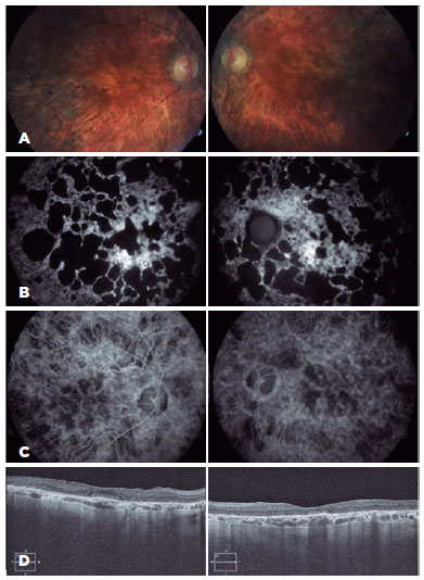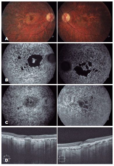 FFA and FA findings were identical to those of her daughter, with a greater degree of progression, consisting of external retinal and choriocapillary atrophy and preserved Haller’s layer. SD-OCT showed atrophy and subfoveal accumulation associated with an epiretinal membrane (Figure 3).