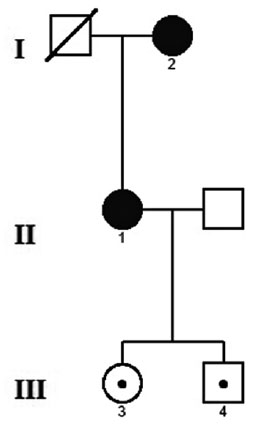 Case 1 has a 22-year-old daughter who has difficulty with night vision (Case 3) and a 19-year-old son (Case 4), who had also undergone a genetic study confirming their status as mutation carriers. A complete ophthalmological examination of Cases 3 and 4 was performed, but no evidence of maculopathy or retinal disorder was determined. For further comprehension, a family tree is illustrated in figure 4.