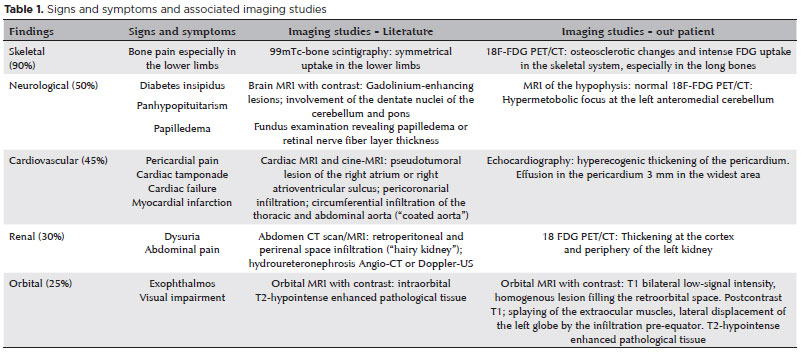 Uma mulher de 42 anos apresentou proptose bi-lateral, quemose, dor nas pernas e perda de visão. Com base em achados clínicos, radiológicos e patológicos, foi diag-nosticada doença de Erdheim-Chester com acometimento orbitário, coriorretiniano e multiorgânico. Trata-se de uma rara histiocitose não Langerhans negativa para a mutação BRAF. Foi iniciado tratamento com interferon alfa-2a (IFNα-2a) e o quadro clínico melhorou. No entanto, quatro meses depois, a paciente apresentou perda visual após a cessação do IFNα-2a. A mesma terapia foi administrada novamente e sua condição clínica melhorou novamente. A doença de Erdheim-Chester é uma doença proliferativa histiocítica crônica rara que necessita de uma abordagem multidisciplinar e pode ser fatal se não tratada, devido a envolvimentos multissistêmicos.
