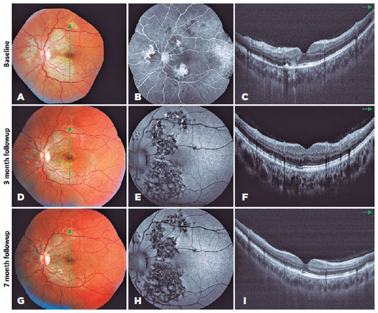 APMPPE represents an uncommon disease characterized by the sudden presentation of yellow-white inflammatory lesions at the RPE level and choriocapillaris. The characteristic APMPPE fundus finding of placoid whitish-yellow deep retinal lesions and usual pattern of early hypofluorescence and late hyperfluorescence corresponding to the placoid lesions on FA were detected in the present case. The typical APMPPE OCT findings of irregularities in the EZ and RPE and the hypo- and hyperautofluorescence of chronic and active lesions were also observed. APMPPE should be differentiated from other conditions that cause deep chorioretinitis, including acute syphilitic posterior placoid chorioretinopathy, serpiginous choroiditis, and acute occult zonal external retinopathy(4). The negative serology for syphilis, multimodal imaging characteristics of placoid lesions, and natural disease course are clinical data that make less probable these three disorders as the diagnosis for the present case.