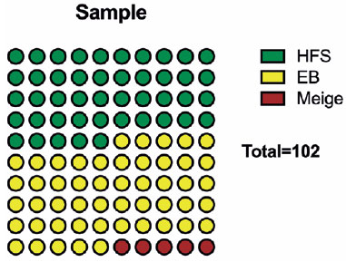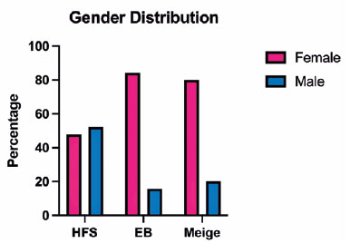 Concerning the sex of the patients, 33 were male (32.3%) and 69 were female (67.7%). Most patients with essential blepharospasm (84.3%) and Meige’s syndrome (80%) were female (Figure 2).
