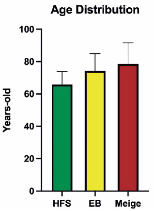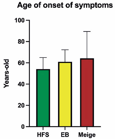 The patients’ ages ranged from 48 to 100 years, with a mean value of 70.63 ± 10.66 years. The mean age of patients with hemifacial spasm, blepharospasm, and Meige’s syndrome was 65.80, 74.22, and 78.40 years, respectively (Figure 3). The mean age at the onset of symptoms was 58.15 ± 12.18 years. The mean age at the onset of symptoms was 54.12, 61.00, and 64.25 years for hemifacial spasm, blepharospasm, and Meige’s syndrome, respectively (Figure 4).