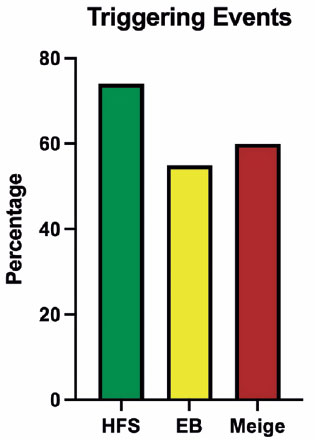 Regarding triggering events, 65 (63.5%) of the patients noted the onset of the disorder was associated with a past stressful event. Other reported events were prior diagnosis of another disease (21.6%), family disagreement (13.7%), death of a loved one (10%), and financial difficulty (7.8%). The presence of triggering events was reported by most patients with hemifacial spasm (74%), essential blepharospasm (55%), and Meige’s syndrome (60%) (Figure 5).
