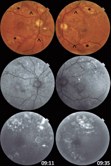 A 61-year-old man with hypertension and a pituitary adenoma diagnosed 3 years ago visited the ophthalmology outpatient clinic for a routine appointment. He had no systemic or ophthalmologic complaints. However, his corrected visual acuity was 20/80 in the right eye and 20/40 in the left eye. The right and left intraocular pressures were 13 and 15 mmHg, respectively. No changes in the anterior segment were noted. Fundoscopic examination showed linear, darkened, and deep lesions in both eyes, starting from the optic disc toward the periphery, compatible with the diagnosis of AS. He also presented yellowish, round, and confluent lesions at the posterior pole, suggesting the appearance of multifocal vitelliform lesions (Figure 1).