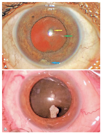 Intraocular foreign bodies are one of the most common causes of open globe injuries(3). Stone is among the commonest materials causing ocular trauma(2,4). Ocular injuries due to IOFBs are variable in presentation, outcome, and prognosis, depending upon several factors. IOFBs can cause direct damage to the ocular tissues but can also bounce in the eye, causing further damage, as in this case. Fortunately, after bouncing off the lens surface, the stone fragment dropped into the lower anterior chamber angle and remained there for 40 years. Further damage depends on the composition of IOFB. For instance, metallic IOFBs can cause siderosis or chalcosis. Inert substances such as stone, glass, or plastic are better tolerated than metals(5). In addition, the mechanism of entry and the object’s size are also factors that determine the extent of the injury. IOFBs entering the sclera usually cause more damage than those entering the cornea(6). As in this case, high-velocity and small IOFBs cause a minor linear laceration that is less damaging than blunt trauma.