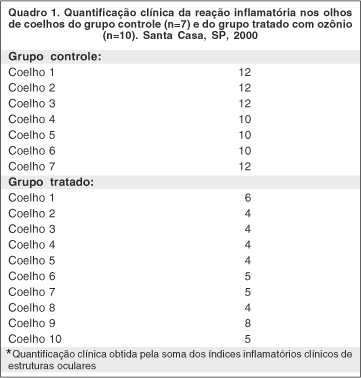 A graduação dos sinais clínicos dos olhos do grupo controle pode ser observada no quadro 1. A média dos parâmetros clínicos analisados neste grupo de 11,14 ± 1,04. Porém nos olhos que receberam ozonioterapia a média da graduação dos sinais clínicos foi de 4,90 ± 1,29. O teste t das amostras estudadas evidencia diferença significante entre as duas amostras, utilizando um intervalo de confiança de 99% (P<0,01).