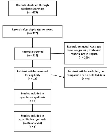The flow diagram of the study selection is presented in figure 1. A literature search was performed on April 30, 2020. A total of 465 studies were identified from the database search. After removing any possible duplicates, 312 unique papers were found to be of our interest. We meticulously screened these records for relevance and retrieved 13 possible studies, followed by their full texts assessed to validate eligibility. Finally, 9 studies were included in our qualitative analyses(28-36). Out of these 9 studies, 3 were excluded due to the lack of numerical results or because of a study design other than RCT(31,35), such that a final of 6 studies were included in the meta-analysis. Whenever possible, communication was established with the authors to obtain more data from the published studies.