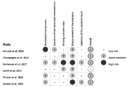 The Risk of Bias (RoB) Cochrane Tool for Systematic Reviews of Interventions was used to evaluate the retrieved RCTs(24). RoB was used to assess several domains of bias considering the trial design, conduct, and reporting, as of low risk of bias, high risk of bias, or unclear risk of bias.