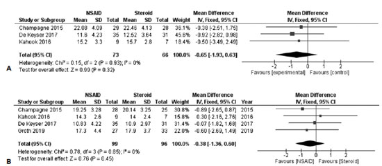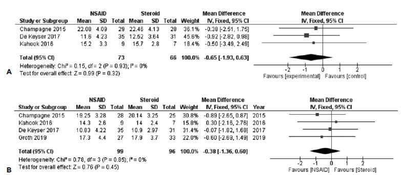 Three studies were combined in the analysis of discomfort 1-week post-SLT, including 90 and 94 subjects in the NSAID and steroid groups, respectively. No statistically significant difference was noted between the groups, with a [FE OR=0.86, 95% CI = (0.33, 2.25), PQ=0.66, I2=0% (Figure 7A)].