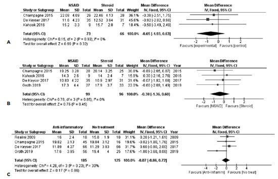 As noted with the assessment of IOPs, any groups of NSAIDs or steroids were combined to estimate the overall efficacy of any anti-inflammatory treatment so as to prevent the development of AC inflammation.