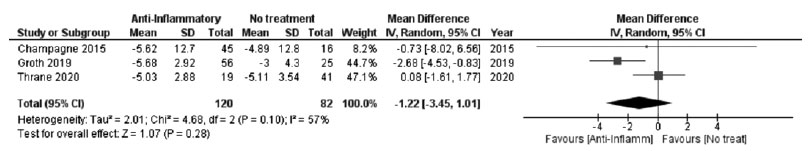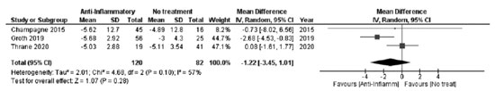 Review Manager (RevMan [Computer program]. Version 5.3. Copenhagen: The Nordic Cochrane Centre, The Cochrane Collaboration, 2014) was used for all statistical analyses. Regardless of the study's design, if one study included an examination of two different anti-inflammatory interventions, pooled measures were used to combine the results of these groups as suggested by the Cochrane Handbook for Systematic Reviews of Interventions guidelines(25).