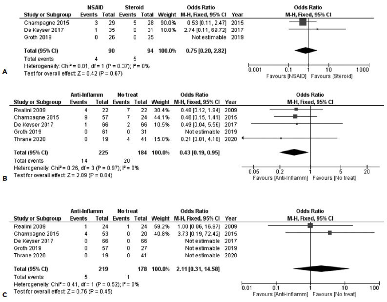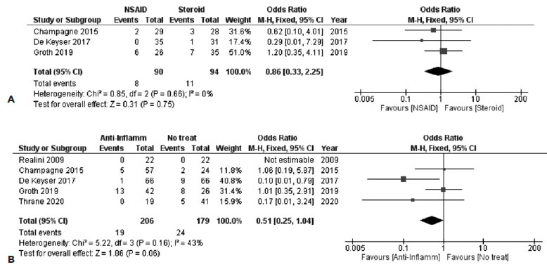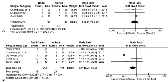 The results of 3 studies consisting of 90 subjects in the NSAID group and 94 in the steroid group were synthesized. No inferiority was noted in any of the anti-inflammatory treatment 1 week after SLT, with FE OR=0.75, 95% CI = (0.20, 2.82), PQ=0.37, I2=0% (Figure 6A).