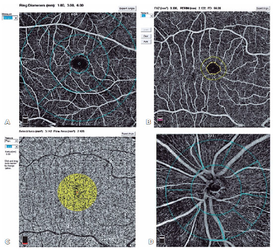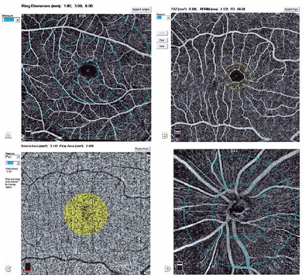 Figure 1. (A) Angiomacula (fovea, parafovea, and perifovea) in 6 × 6 mm scan size. (B) Foveal avascular zone. (C) Choroidal capillary plexus flow area in 1-mm radius circle. (D) Vessel densities for the optic disc at a 4.5 × 4.5-mm scan size.