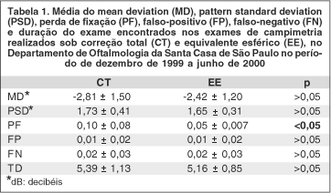 Os resultados da comparação dos exames realizados com correção total (CT) e com equivalente esférico (EE) em relação ao "Mean Deviation" (MD), "Pattern Standard Deviation" (PSD), perda de fixação (PF), falso-positivo (FP), falso-negativo (FN) e duração do exame no que diz respeito à média, desvio padrão (DP) se encontram na tabela 1.