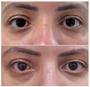 Figure 1. Cosmetic pre- and post-orbital resizing (ethmoidectomy) performed to correct residual right eye exophthalmos in a patient with a history of ethmoidal sinus mucocele drainage.