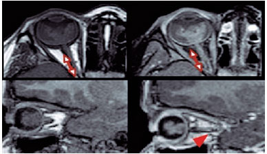 Previous studies have demonstrated that MRI might predict the degree of optic nerve involvement of retinoblastoma, particularly when considering post-laminar optic nerve invasion(11,12). Cui et al. described in their retrospective study a sensitivity of 73.3% for post-laminar optic nerve invasion. However, their results failed to predict prelaminar (42.9%) and laminar optic nerve invasion for laminar invasion (50.0%).