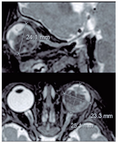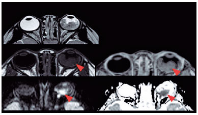 Retinoblastoma is a rare eye neoplasia that occurs only during childhood(2). Although histopathological analysis has demonstrated optic nerve invasion and the degree of differentiation is classically associated with high-risk tumors, noninvasive methods that analyze these features before the surgery are controversial(2). For instance, imaging has been demonstrated as an interesting tool to predict these findings. In this scenario, MRI with DWI has been used in the preoperative evaluation to predict histopathological tumor differentiation based on ADC map values(11). We found that MRI is useful in the diagnosis of retinoblastoma and detection of infiltration of the optic nerve with a sensitivity of 66.6% and specificity of 80%.