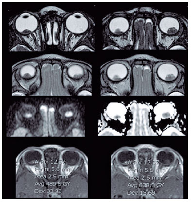 Although postoperative anatomopathological analysis is the gold standard for the differentiation of retinoblastoma grade, emerging noninvasive studies may provide physiological information related to tissue cellularity. For instance, magnetic resonance imaging (MRI), which is an important option in tumor diagnosis and staging(5), may also detect local extension and metastases(6). In addition, MRI combined with diffusion-weighted imaging (DWI), which is a well-known tool for prognostic evaluation in several malignancies such as breast, prostate, and orbit cancer, may be useful in retinoblastoma(7,8). The quantitative analysis of DWI, as the apparent diffusion coefficient map (ADC), gives values in mm2/s for signal strength and may differentiate benign from malignant lesions. Lower ADC map values are attributed to high cellularity and higher nucleus/cytoplasm ratio in poorly differentiated and worse prognosis tumors(4,7,9,10).