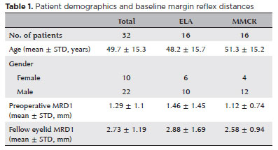 Thirty-two patients with unilateral ptosis were enrolled in the study. The group comprised 22 male and 10 female patients, with ages ranging from 18 to 76 years (mean age: 49.7 years); 16 patients had ELA, while 16 patients had MMCR. The patient demographics are shown in table 1.