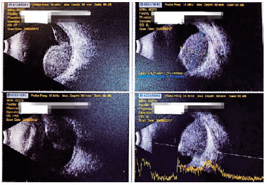 During the first evaluation, she complained of severe eye pain. The best-corrected visual acuity (BCVA) was no light perception (NLP) in OD and 20/30 in the left eye (OS). Tonometry of applanation measurements were 30 mmHg in the OD and 14 mmHg in the OS. The examination of the ocular adnexa revealed eyelid hematoma and edema, with total ptosis, and exophthalmos in the OD. Biomicroscopy showed total hyphema, hematic corneal infiltration, corneal edema, and nonvisualization of the pupil and iris in the OD. Findings on slit-lamp and dilated fundus examinations were within the normal limits in the OS.