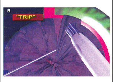 At this time the "chop, trip and free" technique begins. It consists of holding together each piece of fragmented nucleus with the vacuum of the phaco tip, pushing it slightly through and pulling it back in the plan of the iris. Simultaneously, the Nagahara hook with its tip in the horizontal position and parallel to the posterior capsule is introduced below the piece of nucleus and epinucleus in the periphery (Figures 1B, 1C, 2B). Moving the hook in a "tripping" motion, opposite (centripetal) to the movement of the phaco tip, the part of the epinucleus which is adhered to the central portion is liberated ("freed") by the hook (Figures 1D, 2C). Once free, this piece is emulsified and aspirated, using high vacuous with little phaco power, following the previously described parameters. All other pieces which are adhered follow the same sequence.