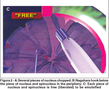 Phacoemulsification begins with the phaco tip positioned with the bevel downward in the central area of the lens, so that it penetrates 2/3 inside when the breaking maneuver is being performed.The Nagahara hook is inserted into the bag opposite to the phaco tip. Due to the hardness of the nucleus, in many cases it is not possible to totally break down the nucleus, because the posterior crystalline lens fibers or hard epinucleus (the latter is a clinical term used to describe the outermost part of the nucleus or the innermost part of the cortex)(1) are intertwined (Figure 1A). By rotating the lens, several pieces of nucleus are broken ("chopped") in the whole circumference (Figure 2A). At the end, the epinucleus area is not totally divided. In this situation, phacoemulsification and aspiration are very difficult to be performed.