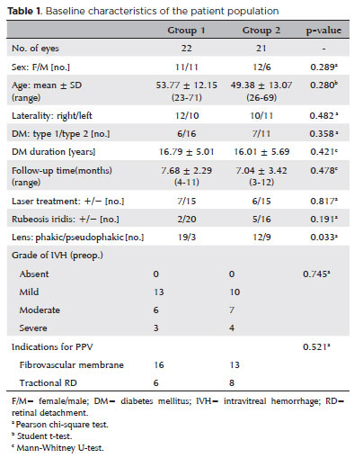 In both groups, patient characteristics including age, sex, visual acuity, type of diabetes mellitus, history of laser photocoagulation and intravitreal injection of any drug, presence of rubeosis iridis at predilatation, lens status, intraocular pressure, and presence and severity of intravitreal hemorrhage are shown in table 1.
