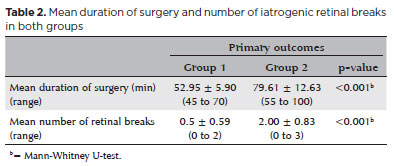 The mean surgery time in group 1 (52.95 ± 5.90 min) was significantly shorter than that in Group 2 (79.61 ± 12.63 min) (p<0.001). The mean number of iatrogenic retinal breaks was 0.50 ± 0.59 (range, 0-2) in Group 1 and 2.00 ± 0.83 (range, 0-3) in Group 2 (p<0.001) (Table 2).