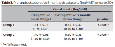 Preoperative LogMAR visual acuity values were 1.44 ± 0.11 in Group 1 and 1.40 ± 0.08 in Group 2. At 3 months postoperatively, they were 0.48 ± 0.37 (range, 0.1-1.3) LogMAR in Group 1 and 0.60 ± 0.35 (range, 0.1-1.4) LogMAR in Group 2. Visual acuity improved significantly in both groups (p<0.001; Table 3).