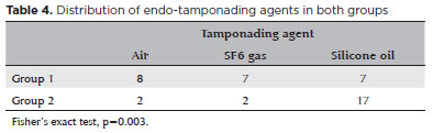 PPV was combined with cataract extraction with phacoemulsification and intraocular lens implantation in 17 and 12 eyes in Groups 1 and 2, respectively. The postoperative endo-tamponading agents were air in 8 eyes, SF6 gas in 7 eyes, and silicone oil in 7 eyes in Group 1. In Group 2, these were air in 2 eyes, SF6 gas in 2 eyes, and silicone oil in 17 eyes (Table 4). This difference was statistically significant between the two groups (p=0.003).