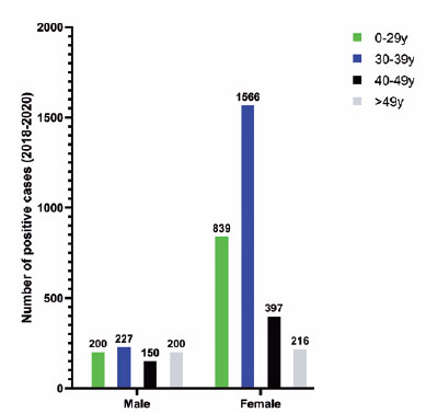 In women, the greatest number of positive cases (1,566) during the study occurred in the age group of 30-39 years (51.9%). There was no significant difference in the distribution of cases in relation to age in men (Figure 1).