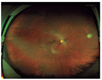 Figure 3. Wide field fundus color photography. The arrow shows a peripheral retinochoroiditis lesion 3 months after the onset of systemic acute toxoplasmosis.