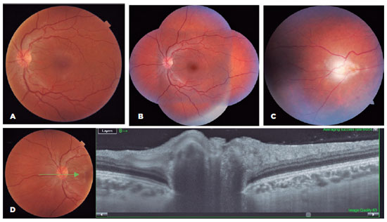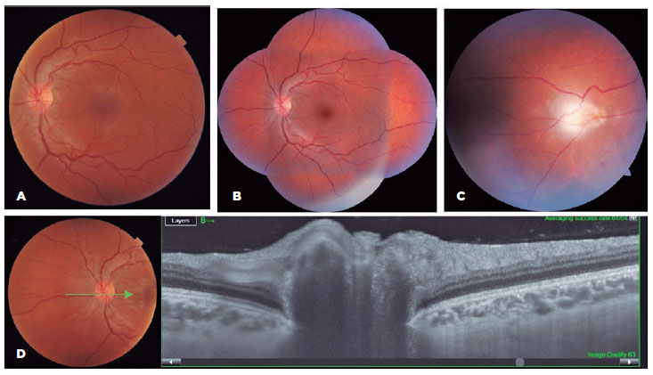 A 24-year-old woman confirmed attending the Arabic restaurant (on the same day as case 2 and one day before case 4) where she consumed only vegetarian food. After 8 days she developed symptoms of headache, myalgia, adenomegaly, malaise, and fever. After 10 days without improvement, serology for toxoplasmosis showed positive IgG and IgM (ELISA), but she was not treated. After 2 months, the patient complained of floaters. Ophthalmological evaluation showed vitreous cells and optic nerve hyperemia in both eyes, and an active retinochoroiditis lesion in her left eye. OCT showed signs of inflammation of the optic disc (Figure 4).