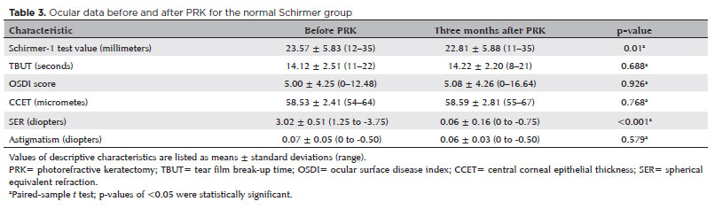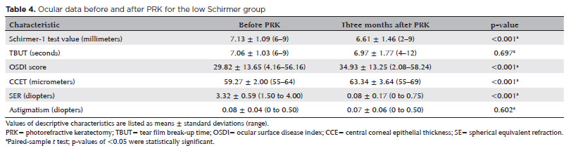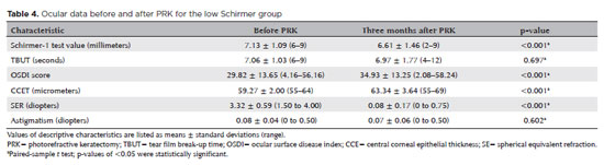 RESULTS: We found significant differences between the groups in Schirmer-1 test value, tear film break-up time, and ocular surface disease index score, both preoperatively and postoperatively (p<0.001). The preoperative central corneal epithelial thicknesses of the two groups were similar (p>0.05). After photorefractive keratectomy, the Schirmer-1 test value and spherical equivalent refraction decreased in both groups (p<0.05), and ocular surface disease index scores and central corneal epithelial thickness values increased in the low Schirmer Group (p<0.001) but not in the normal Schirmer Group (p>0.05). The postoperative central corneal epithelial thicknesses of the low Schirmer Group were significantly higher than those of the normal Schirmer Group (p<0.001). Postoperative uncorrected distance visual acuity did not differ significantly between the two groups (p>0.05).